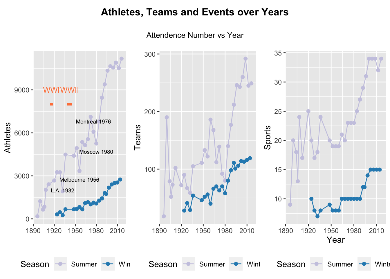 These graphs are drawn from 3 different aspects over the Olympics movement, which include the total number of athletes, the total anticipated teams and the number of different sports. Since there are Summer Olympics and Winter Olympics, two lines of each season were graphed.