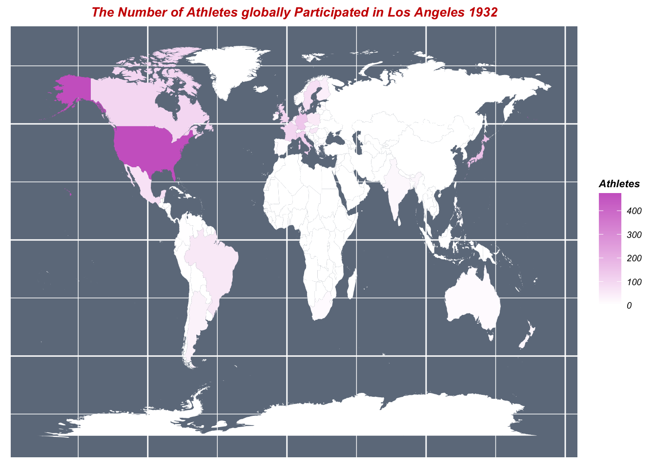 The 120-year Olympics can be split into several parts based on the drop year mentioned in graph 1, for instance, 1896-1932, 1932-1956, 1956-1976, and 1976-1980. Referring to the graph 1, we highlight four Olympics events respectively in 1932, 1956, 1976, and 1980 to analyze and draw choropleth maps to visualize the geographic distribution of athletes at each Olympics Games.