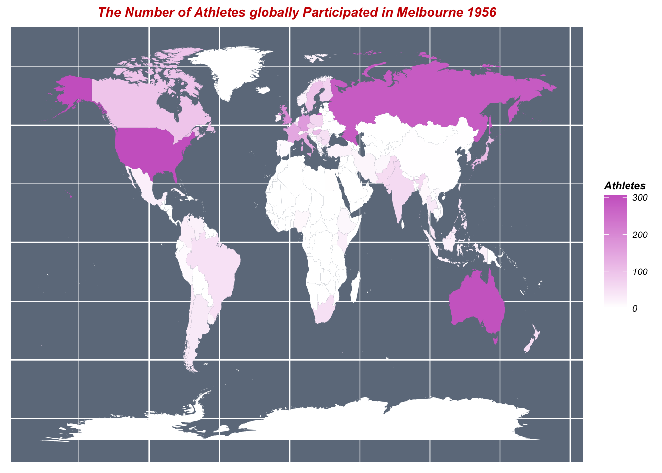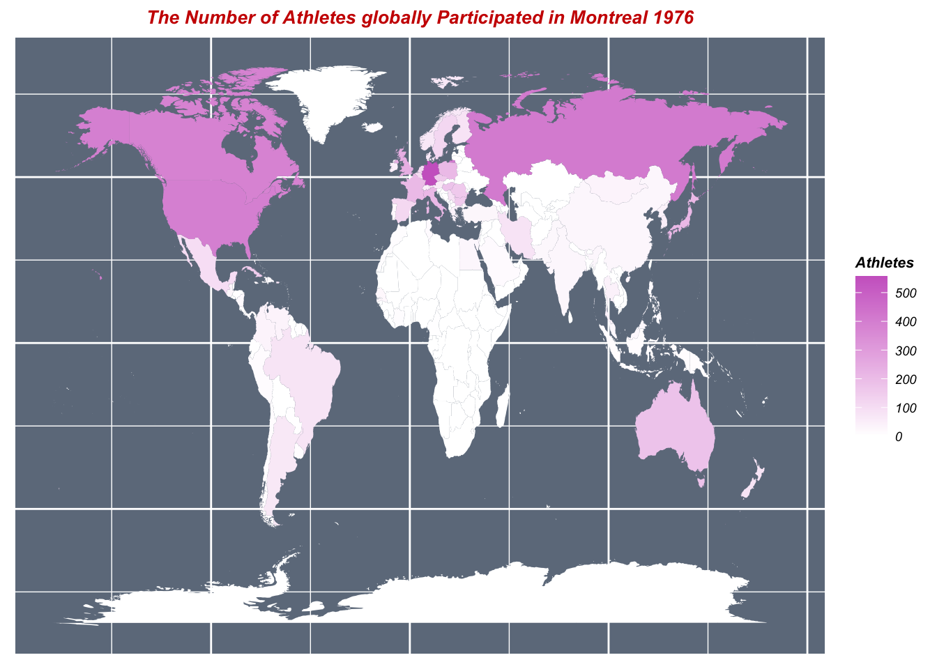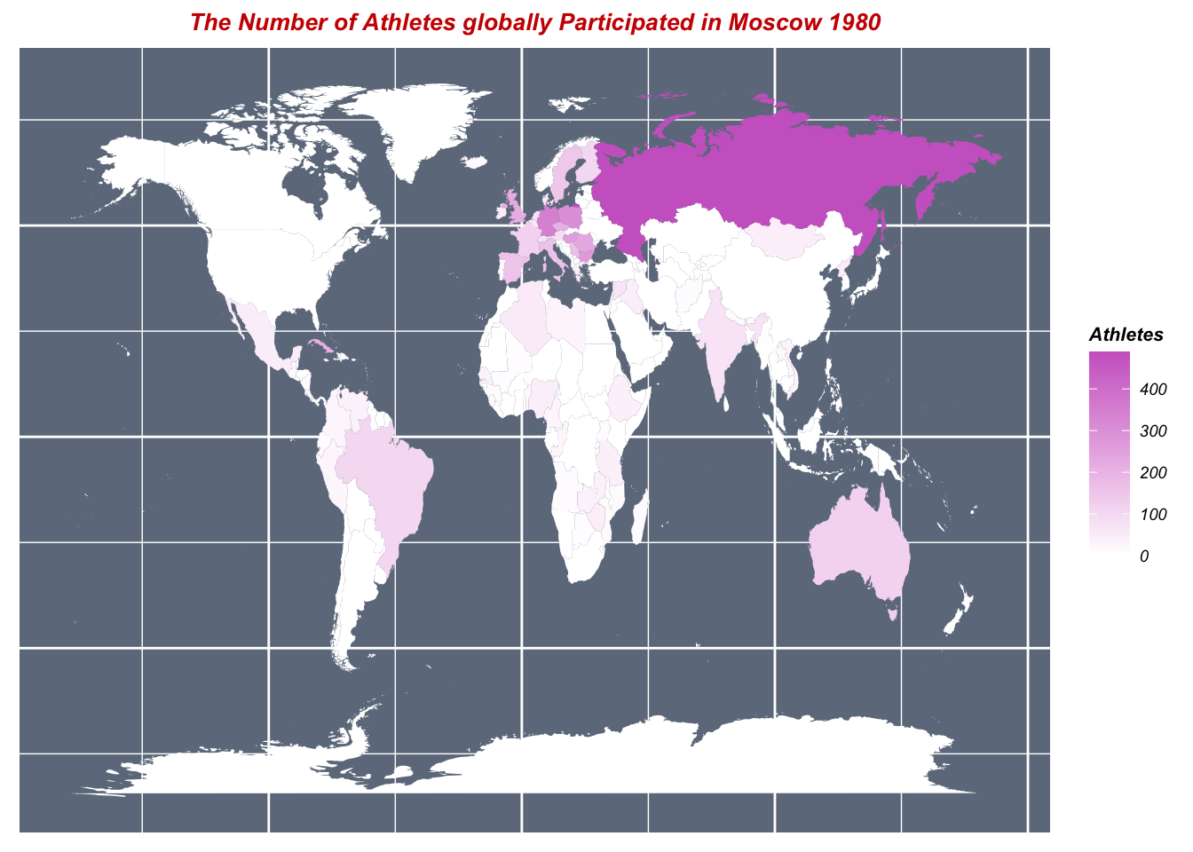 These four graphs above show the geographic distribution of the Olympics athletes from different nations in L.A., Melbourne, Montreal and Moscow Olympics. With the improvement of society overtime, it tends to show that the number of participants is increasing, and the geographic distribution of the Olympics has expanded a lot. However, there are still some nations that do not have a lot of participants, such as Africa, the Middle East and South America, etc. These countries share the same characteristics that they were underdeveloped countries.