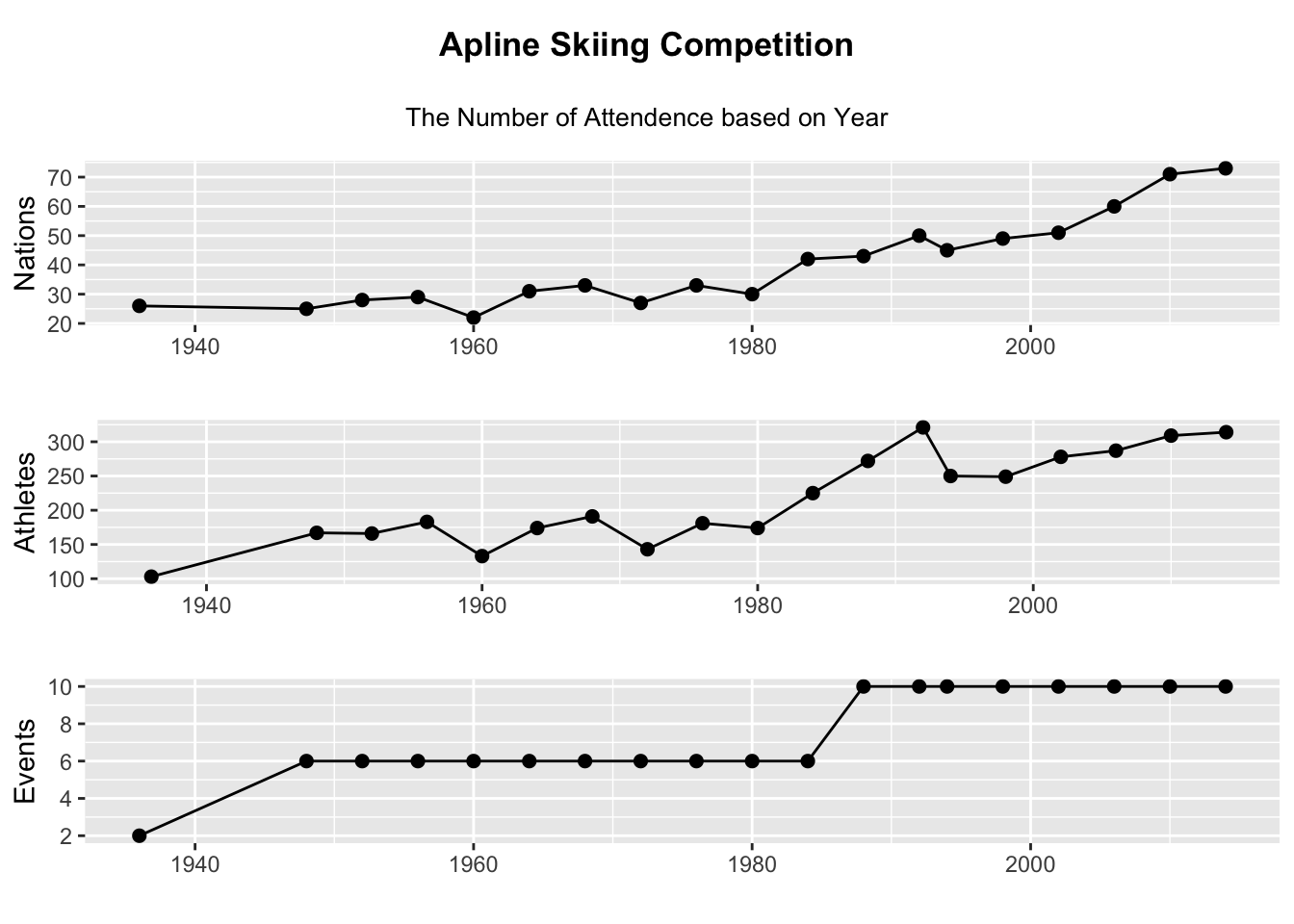 These two graphs show the relationship between the number of nations participating in different events over time and the number of athletes participating in different events over time. The number of athletics and the number of nations tend to share the same diagram pattern. Moreover, in 1995, there was a large increase in the number of participants in athletics and nations in each different individual event. This data shows more and more winter sports were started to get accepted and appreciated by more people in that year.