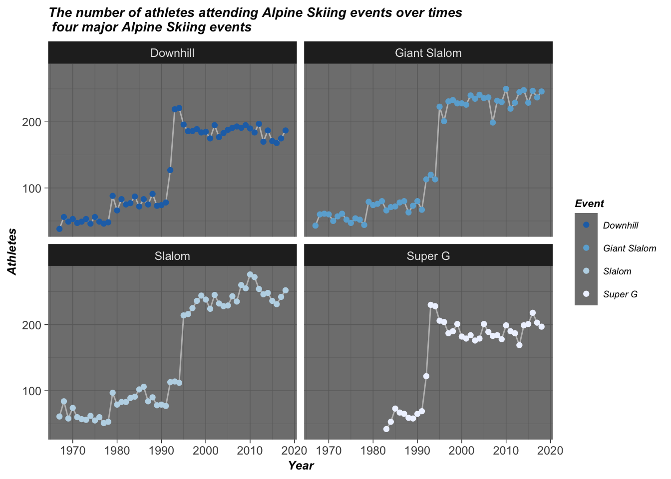 Compared to Olympics, Alpine Skiing events have slight differences in the ranking of total medal numbers countries winning over the year. From the above plot, Austria, Switzerland, and France won more medals than the United States over the year. Australia, Switzerland, and France have their advantages concerning geographic factors and the places holding Alpine Skiing events. For instance: