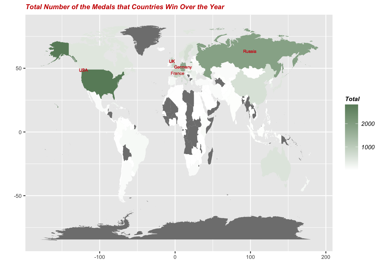 The following graph 6 shows the global map to visualize the total medals won by each participating nation over the years. The color darkness scale represents the actual metals, including gold, silver, and Bronze medals. The gray color represents the nations that have never won an award before.