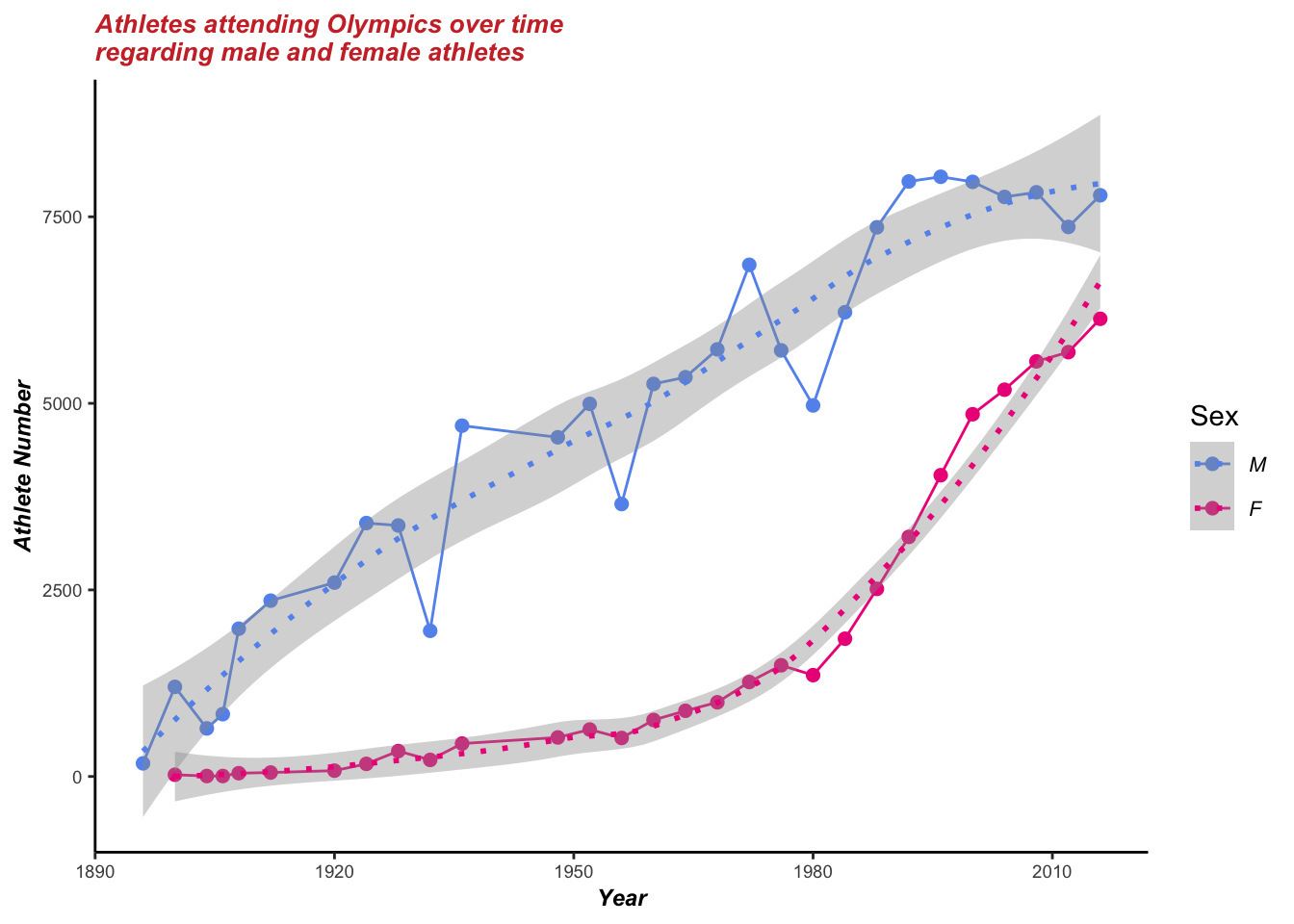 We can see that as time passed, at first, there were almost no female participants in the Olympics till the 1920s, and nearly all participants were male.